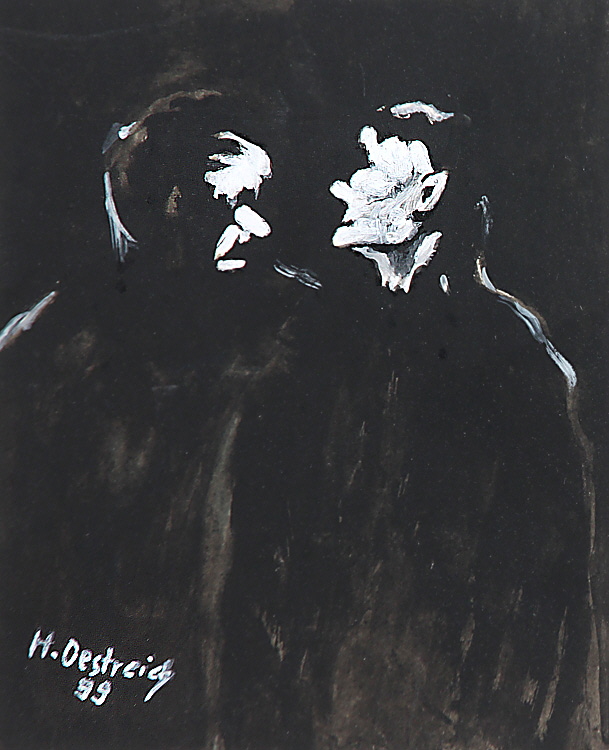 „Zwei Männer im Gespräch“. Li. u. sign. H. Oestreich, dat. (19)99. Aquarell und Tuschpinsel, weiß gehöht/Papier, ca. 25,8 x 20,8 cm (Bildausschnitt). Vergl. R..