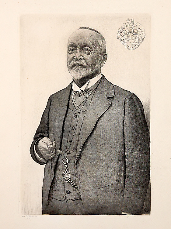 1855 Süderau – 1917 Kassel; deut. Maler und Grafiker. Studium an der Münchner Akad. bei Ludwig Löfftz. Gründungsmitglied der Münchner Sezession. „Herrenbildnis“. Radierung, re. u. handsign. Hans Olde. 29 x 19 cm.