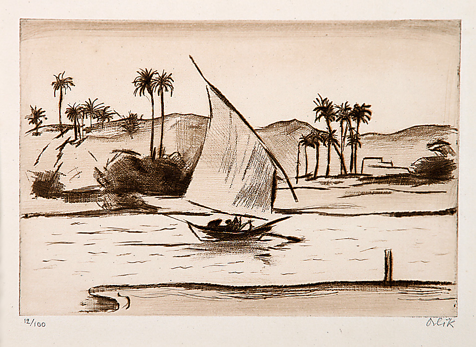 „Nillandschaft“. Radierung, re. u. handsign. Orlik, Aufl. 12/100. 11,5 x 16,8 cm. Mit den oberen Bl.Ecken auf Passepartout montiert.