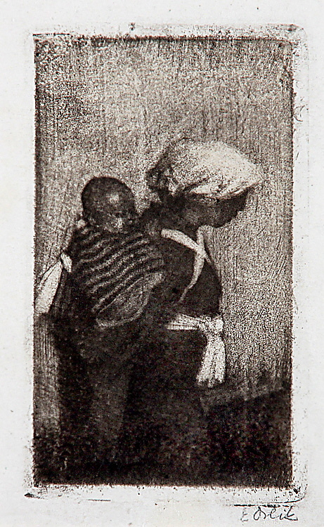„Mutter mit Kind“. Radierung, re. u. handsign. E. Orlik. 9,5 x 5,5 cm. Mit den oberen Bl.Ecken auf Passepartout montiert.