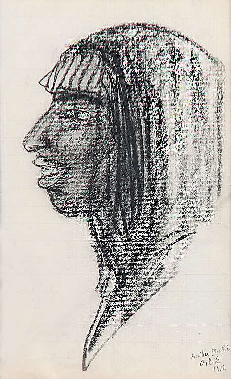 „Aniba (Nubien)“. Re. u. sign. Orlik, dat. 1912, betit.. Kohle/Papier, 18,2 x 10,5 cm. Passepartout, vergl. R.. Bilderglas gerissen. Provenienz: rheinische Privatsammlung.