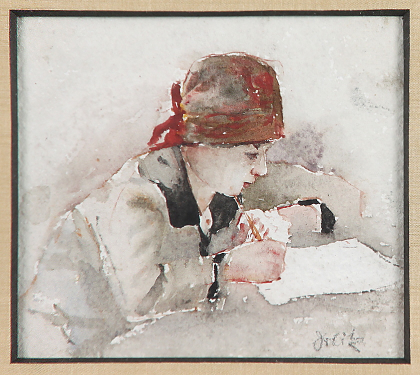 „Briefschreiberin“. Re. u. sign. Orlik. Aquarell/Bütten, ca. 12 x 13,7 cm (Bildausschnitt). Passepartout, vergl. R.. Provenienz: rheinische Privatsammlung.