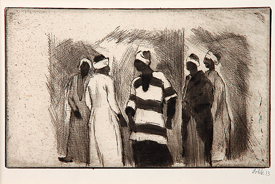 1870 Prag – 1932 Berlin; deut.-böhm. Maler, Grafiker und Kunstgewerbler. Schüler von H. Knirr, W. Lindenschmidt und J. L. Raab in München. 1905/32 Prof. an der Unterrichtsanstalt des Kunstgewerbemuseums bzw. den Vereinigten Staatsschulen in Berlin. „Fünf Ägypter beisammenstehend“. Radierung, re. u. handsign. Orlik, dat. (19)13. 12 x 20 cm. Mit den oberen Bl.Ecken auf Passepartout montiert.