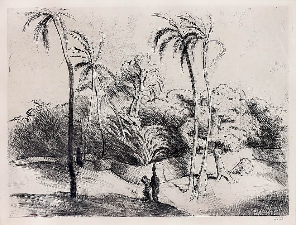 „Auf Elephantine“. Radierung, re. u. handsign. Orlik, betit.. 30,2 x 40,5 cm. Mit den oberen Bl.Ecken auf Passepartout montiert.