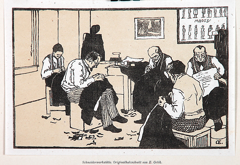 „Schneiderwerkstätte“. Orig. Holzschnitt, re. u. im Druckstock sign. OE. 12 x 18,4 cm. Mit den oberen Ecken auf eine orig. Buchseite, unten mit Bildtitel, montiert.