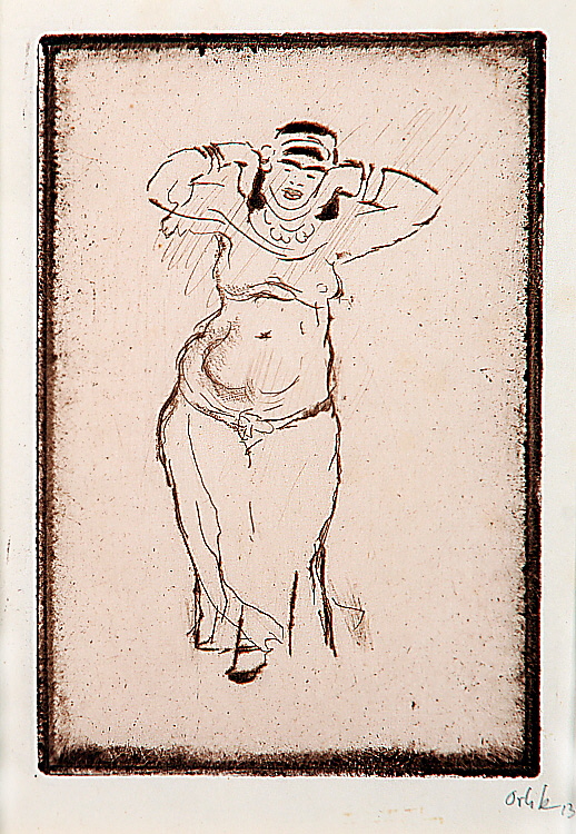 „Bauchtänzerin“. Radierung, re. u. handsign. Orlik, dat. (19)13. 14,8 x 10 cm. Mit den oberen Bl.Ecken auf Passepartout montiert.