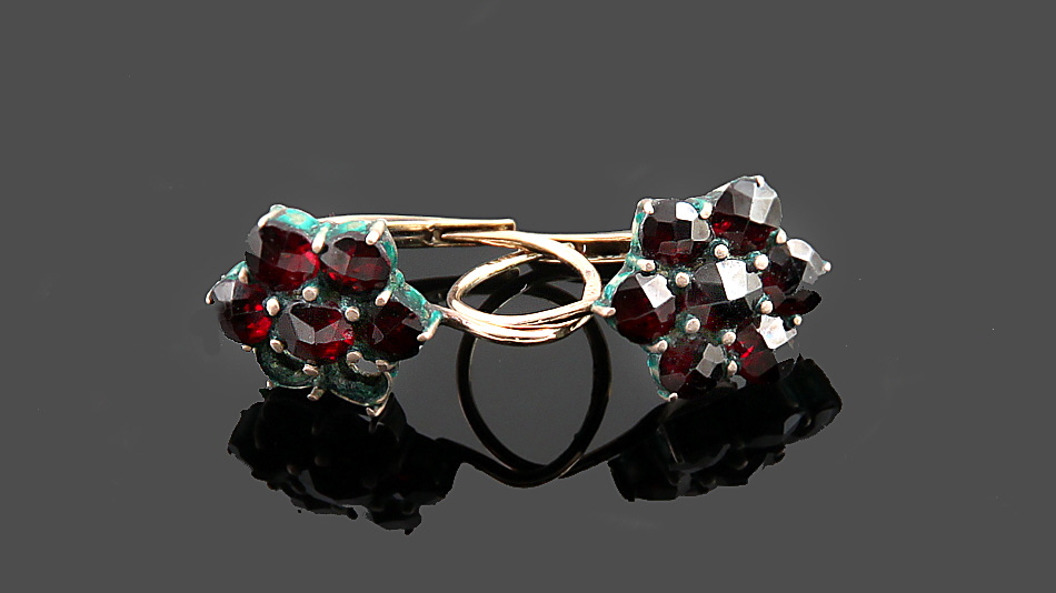 GG 333. Blütenform. Zwei Steine fehlen, eine Halterung mit alter Lötstelle. L ca. 1,4 cm. Zus. 1,6 g brutto.