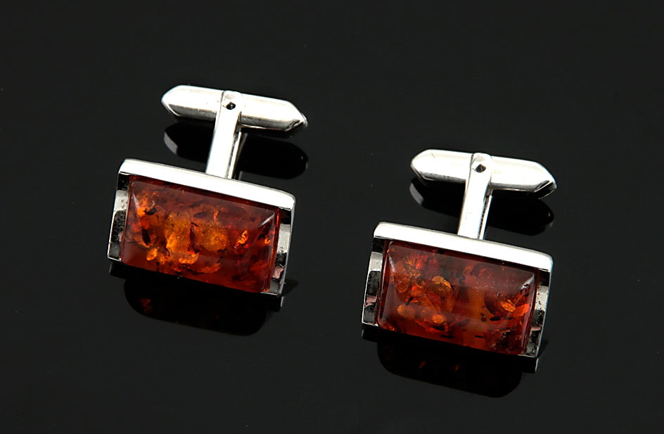 835er Silber. Rechteckfassung mit Bernsteincabochon. Ein Stein etwas best.. L ca. 2,6 cm. Zus. 16,2 g brutto.