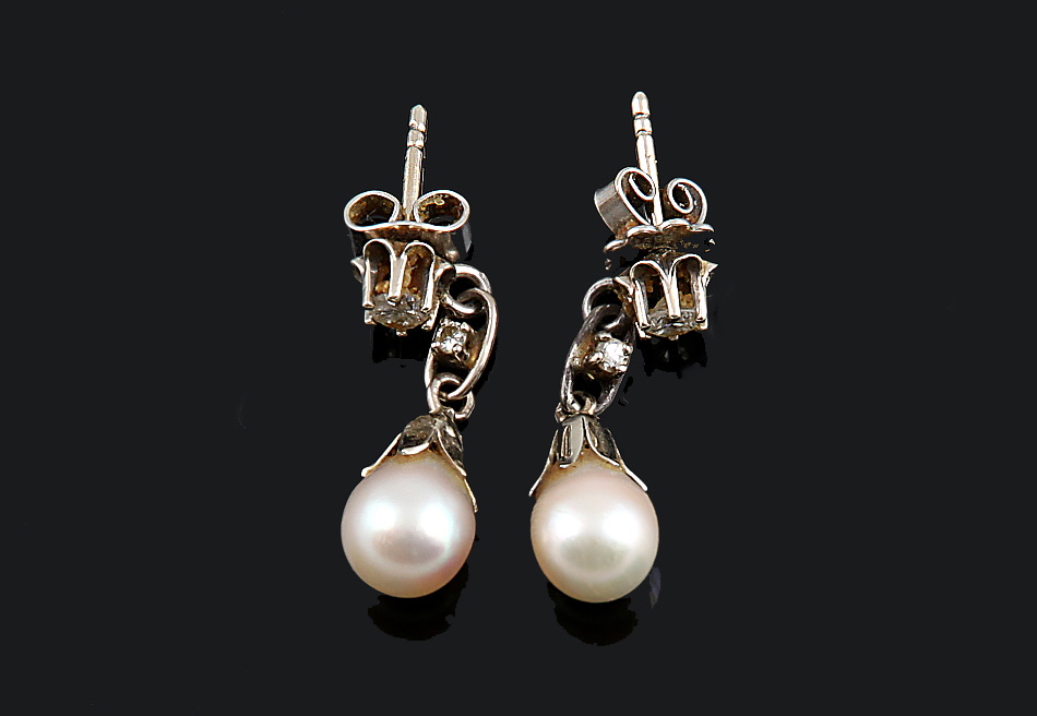 WG 585. Zuchtperle, D 6,5 mm, 7 mm, jeweils zwei Diamanten, zus. ca. 0,24 ct, W, si-P1. Zwei etwas unterschiedliche Flügelschrauben. L ca. 2,5 cm. Zus. 3 g brutto.