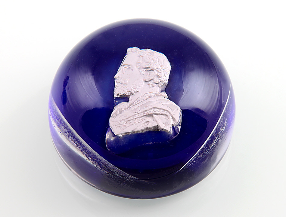 Farbl. und kobaltblaues Überfangglas, eingeschmolzenes Glaspastenbild, Portrait eines Mannes im Profil. D 8 cm.