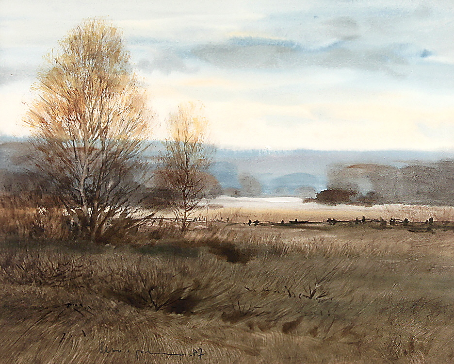 *1937 Köttnitz, CSR. Ausbildung in Aquarell und Ölmalerei bei Prof. Goll in Stuttgart, bei W. Luib und Rosenbusch in Ulm. „Herbstlandschaft“. Mi. u. sign. Otto E. Pelzer, dat. (19)87. Aquarell/Papier, ca. 38,5 x 48,5 cm (Bildausschnitt). Passepartout, vergl. R..