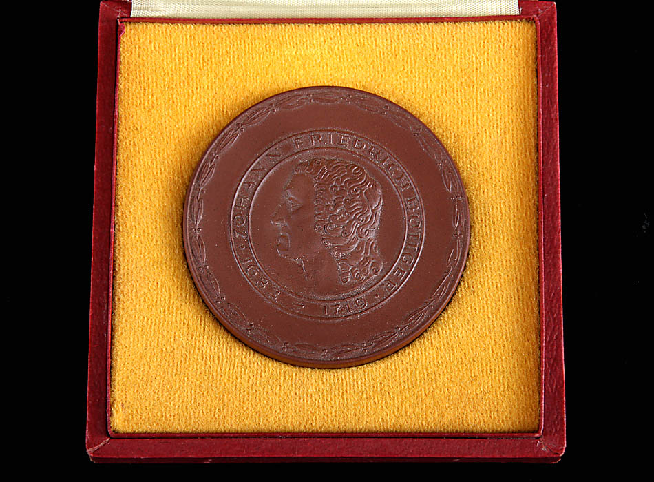 „Johann Friedrich Böttger 1682-1719“. Meissen, Böttgersteinzeug, Schwertermarke. D 6,5 cm. Im orig. Etui.