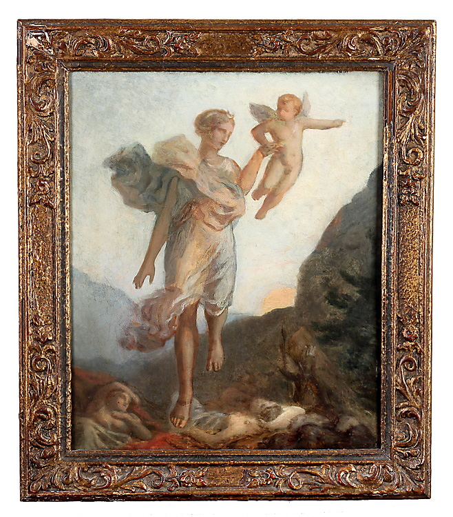 „Amor führt die Göttin Diana aus dem Kreis ihrer schlafenden Gespielinnen dem Endymion zu“. Öl/Lwd., 46 x 38 cm. Stuckr. (etwas best.).