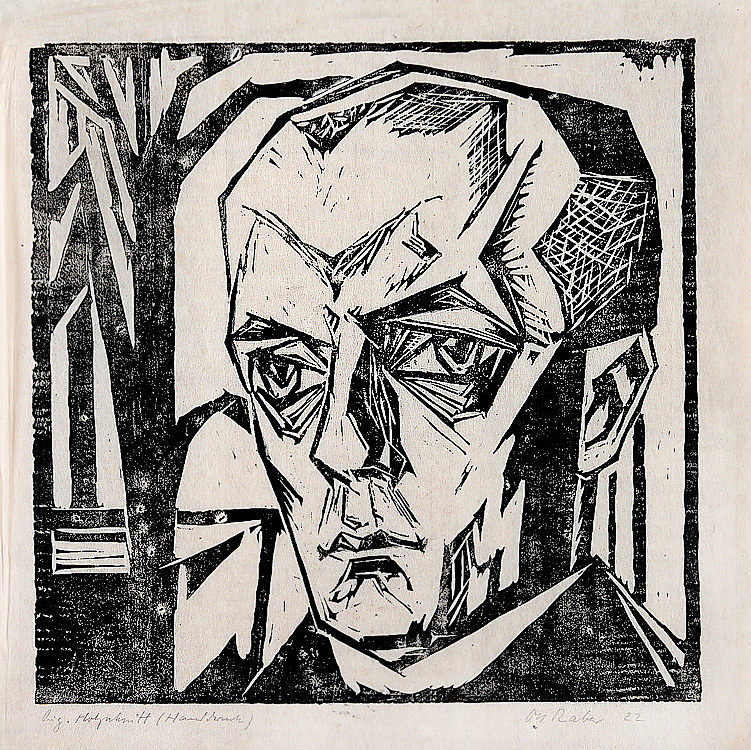 „Männerbildnis vor Bäumen“. Holzschnitt/dünnem Japanbütten, Handdruck, re. u. handsign. Osc Raber, dat. (19)22. 29,4 x 29,8 cm. Bl.Ränder stellenweise etwas knitterig.