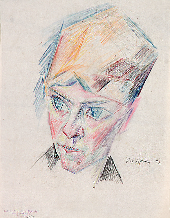 1892 Koblenz 1947; deut. Maler, Grafiker und Bildhauer. Ausbildung in der Bildhauerwerkstatt von Kröner & Polder, seit 1917 Malstudien bei William Straube. „Kopfstudie“. Re. u. sign. Osc Raber, dat. (19)22. Buntstifte/dünnem Papier, 26,5 x 19 cm. Im Papier zahlreiche kleine Druckstellen und mehrere Löchlein, auf den beiden oberen Ecken Reste einer Papiermontierung.