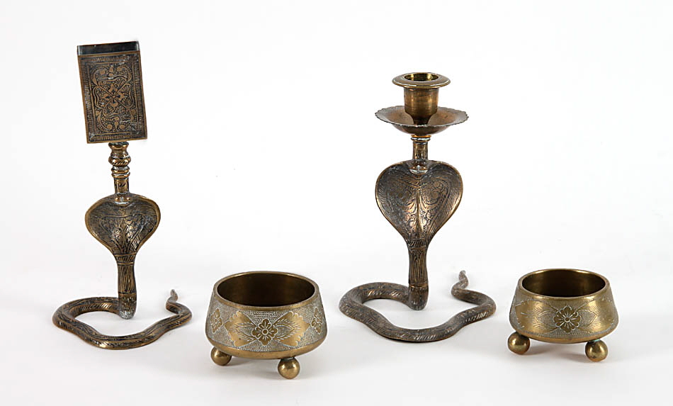 Indien. Streichholzhalter und Kerzenleuchter in Form einer Kobra, zwei runde, konische Schalen auf Kugelfüßen. Messing, Reliefverzierungen. Halter und Leuchter: H 20 cm, 17,2 cm, Schalen: H 4,6 cm, 5,2 cm.