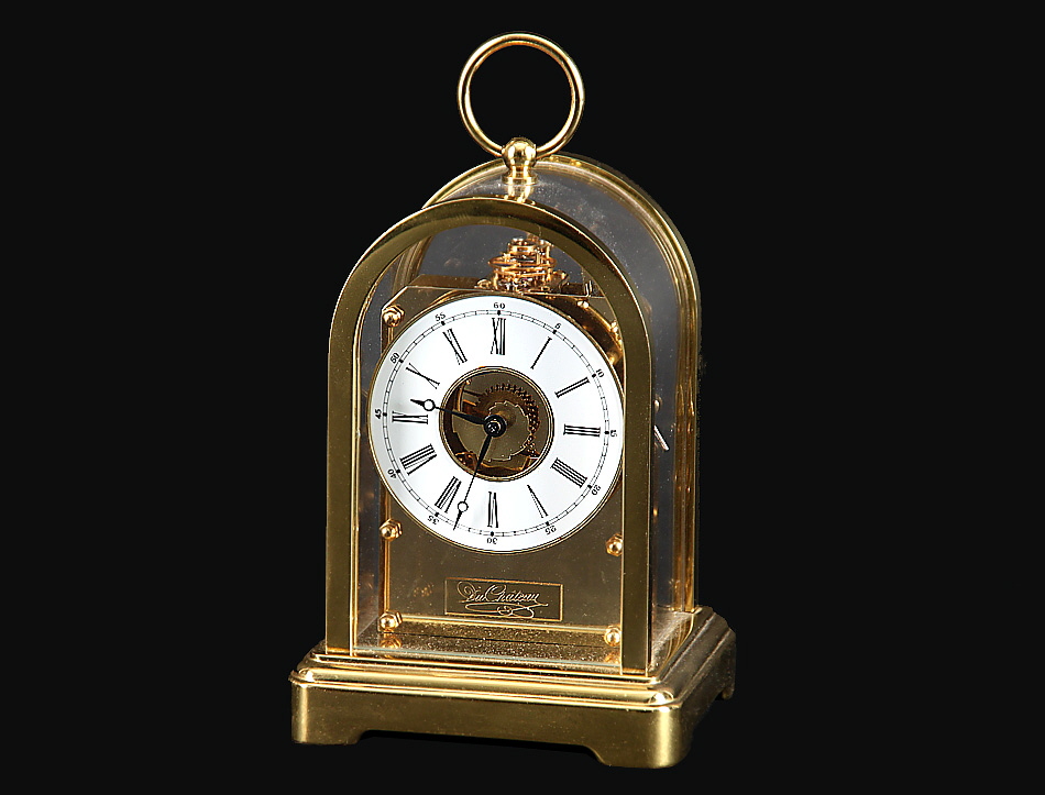 Du Château. Poliertes Messinggehäuse rundum mit Kunststoffverglasung. Weißes Zifferblatt, schwarze röm. und arab. Ziffern, schwarze Metallzeiger. Werk mit 13 Steinen, Schlüsselaufzug, Rechenschlagwerk für volle und halbe Stunden auf Messingglocke. Gangbar. H 15,5 cm.