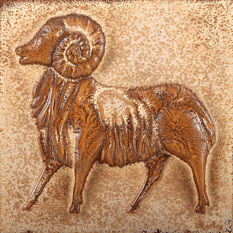 „Widder“. Villeroy & Boch, Mettlach, Blindstempel: „Handarbeit Villeroy & Boch Mosaikfabrik Mettlach“. Grau-braun glasierte Keramik. 30 x 30 cm.