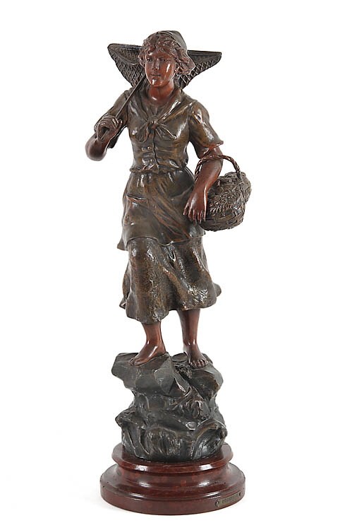 „Pêcheuse“. Braun und grau patinierter Metallguss. Auf dem runden Holzsockel Messingschild mit Titel, bez.: „Par A. Ruchot“. H ohne Sockel 51 cm.
