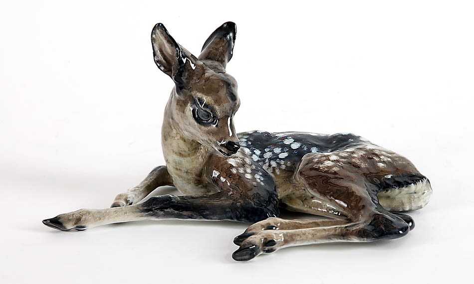 Rosenthal, Kunstabteilung Selb, Manufakturstempel, um 1940. Entwurf: Fritz Heidenreich (1895-1966), bez.: FHeidenreich. Ugl. feine Buntbemalung. H 13,7 cm, L 27,3 cm.