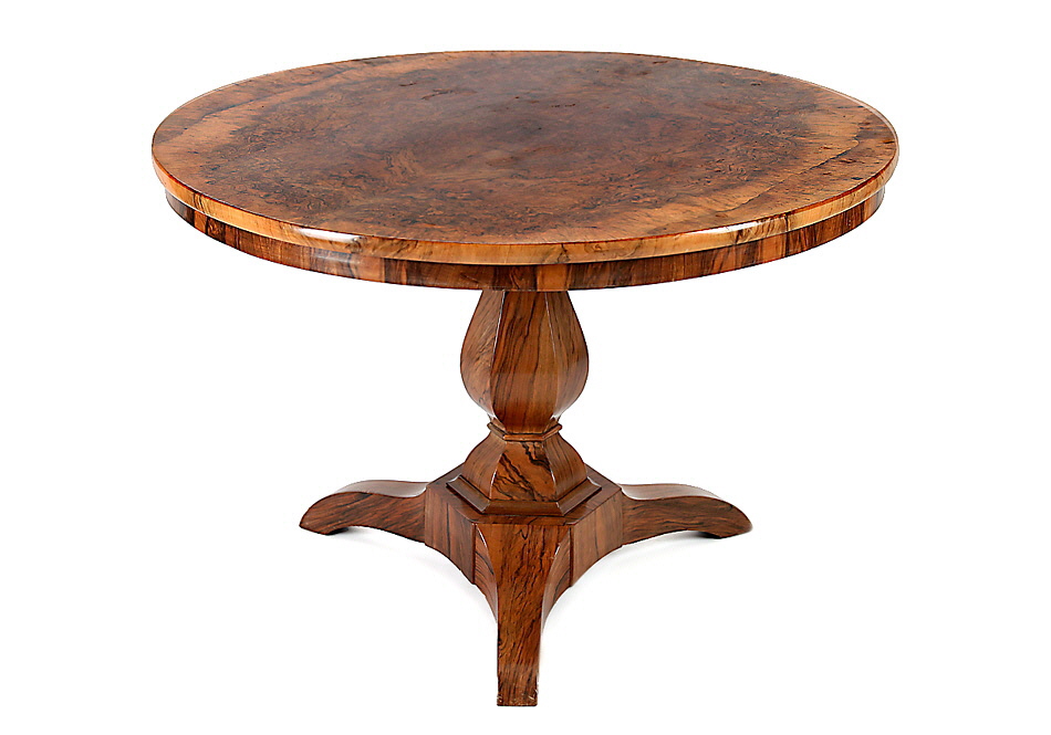 Deutsch, 1. Hälfte 19. Jh.. Nussbaum furniert, poliert, Blindholz Nadelholz. Feines, ausgesuchtes Nusswurzelfurnier. Runde Platte mit glatter Zarge, balusterförmiger Unterbau auf dreifüßigem Sockel. H 70,3 cm, D 105 cm. Zustand B.