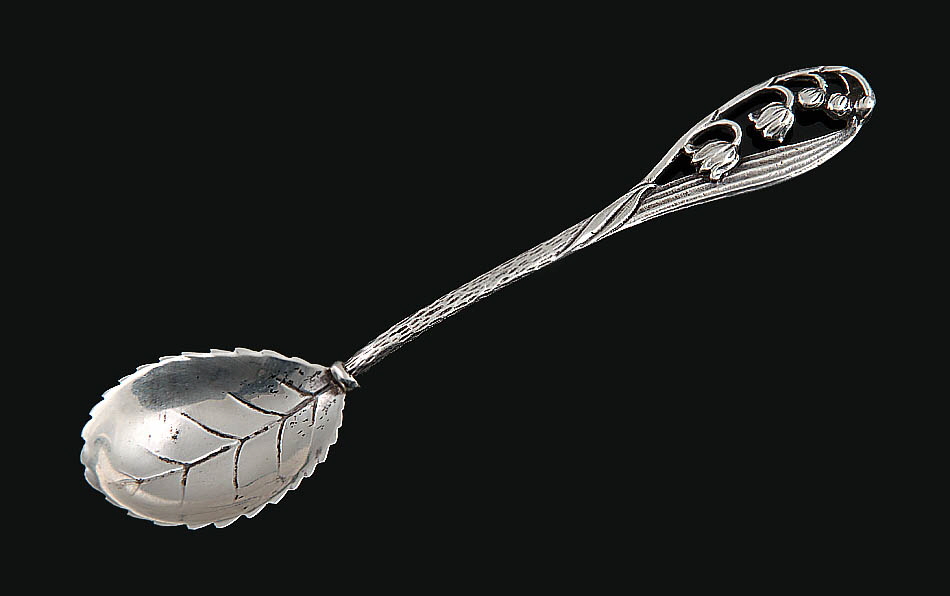 800er Silber, Herstellermarke: Christoph Widmann, Pforzheim. Laffe in Blattform, Stiel in Form eines Stengels mit Maiglöckchen. L 12 cm. 13,4 g.