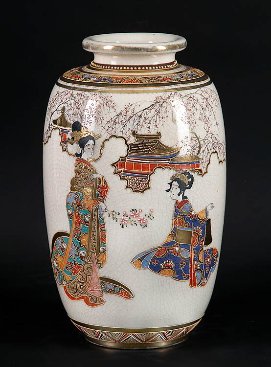 Japan, Meiji-/Taishô-Periode. Am Boden ügl. eisenrotes Schriftzeichen. Balusterförmiger Gefäßkörper. Hellgraue Glasur mit Craquelé, feine Malereien in bunten Emailfarben, auf der Wandung figürliche Szenen, auf der Schulter und über dem Boden verschiedene Ornamentbänder und Golddekor. H 31,2 cm.