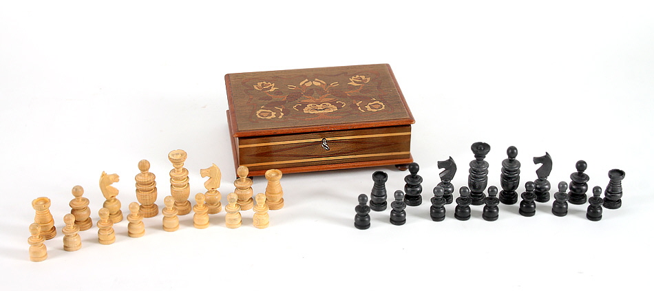Holz gedrechselte, teils schwarz eingefärbte Schachfiguren. Im intarsierten Holzkasten mit Schloss und Schlüssel. 23 x 17 x 7,5 cm.