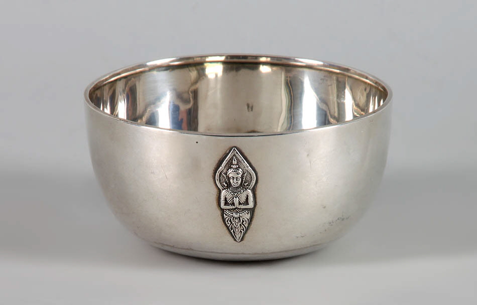 Sterlingsilber. Runde, bauchige Form. Auf der Wandung drei buddhistische Figurenreliefs. H 5,5 cm, D 10,9 cm. Über dem Boden mehrere kleinere Beulen. 86,5 g.