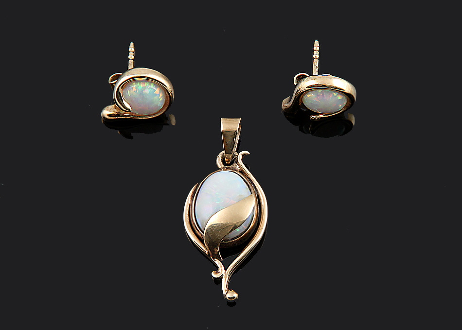 Anhänger, Paar Ohrstecker. GG 333 und 375. Weiße Opale. Anhänger: L ca. 3,1 cm, Ohrstecker: L ca. 1,5 cm. Zus. 4,6 g brutto.