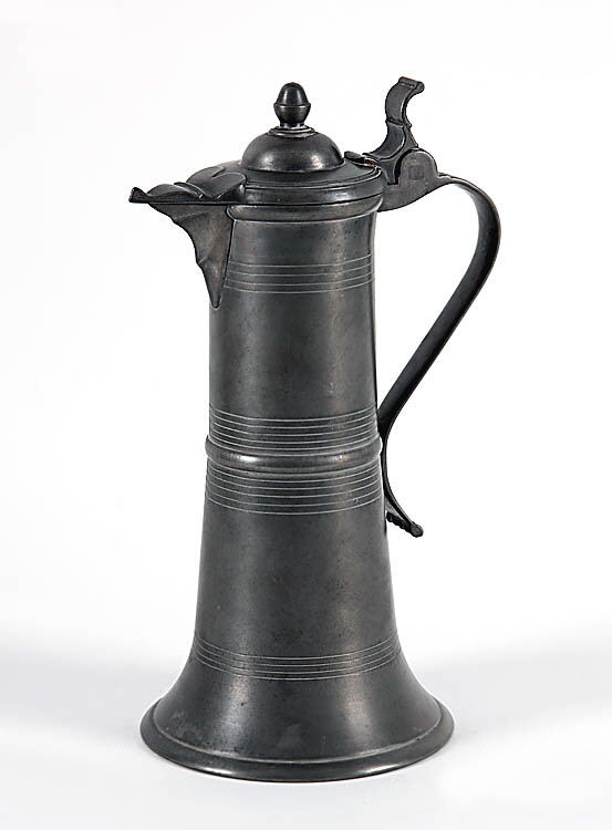 19. Jh.. Zinn. Im Boden dreifach gestempelt, auf dem Bandhenkel Engelmarke. H 34,2 cm.
