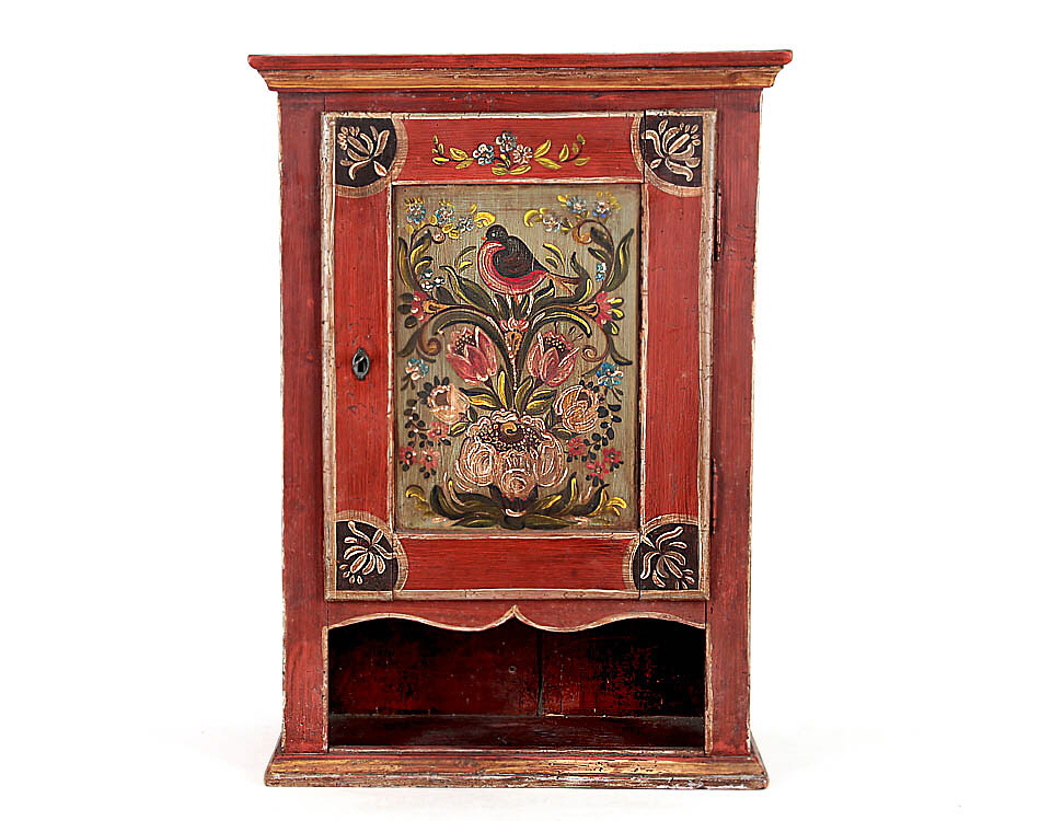 Deutsch, 19. Jh.. Nadelholz. Dunkelrot gefasst, bunte Bauernmalerei. Tür mit glatter Rahmenfüllung, darunter offenes Gefach, vorkragendes Profilgesims. Innen zwei Ablageböden und zwei Schubladen (Griffe wurden entfernt). H 73,5 cm, B 53 cm, T 24 cm. Zustand B/C (partiell alter Wurmbefall).