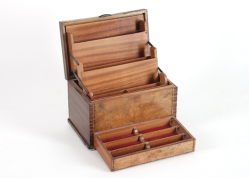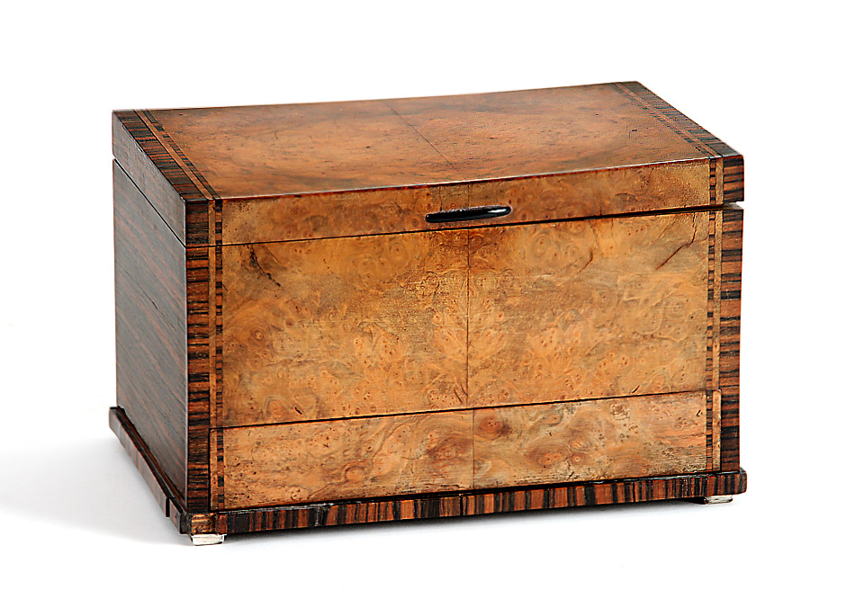 Ca. Ende 19. Jh.. Feines Wurzelholz- und Palisanderfurnier. Ausziehbare Gefächer für verschiedene Utensilien. L 24,2 cm, B 15,6 cm, H 15 cm. Stellenweise etwas fehlendes Furnier.