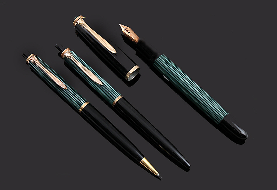 Pelikan. Kolbenfüllfederhalter mit Goldfeder 585, Kugelschreiber, Druckbleistift. Braunes Lederetui.