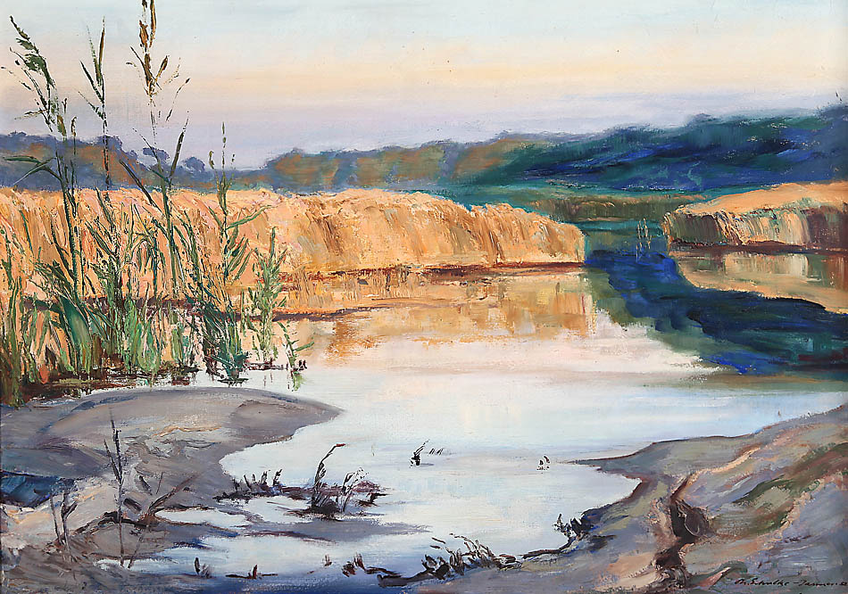 1888 Oschatz – 1975 Prerow; deut. Maler, Grafiker und Fotograf. Studium an der Königl. Akad. für Graphische Künste und Buchgewerbe in Leipzig. „Darß – Weststrand“. Re. u. sign. Th. Schultze-Jasmer, dat. (19)52, verso Künstlerstempel. Öl/Karton, 50 x 70 cm. R..