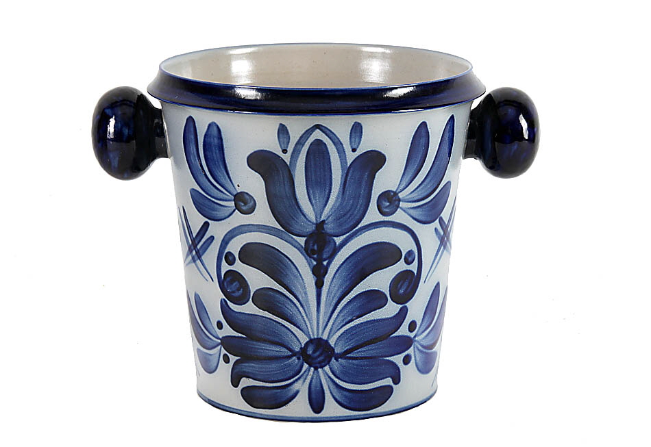 Sektkühler. Sign. Balzar Kopp. Anfang 1980er Jahre. Konische Form, zwei kugelige Handhaben. Salzglasiertes Steinzeug, handgedreht, Bemalung grau-blaue Smalte. H 22 cm, D oben 22,2 cm.