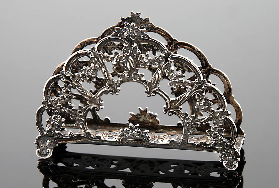 800er Silber, Herstellermarke. Reliefmuster in Form von Blumenranken, Zierdurchbrüche. H 7,5 cm, L 10,3 cm. 42 g.