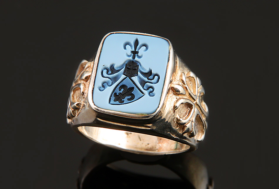 925er Silber. Schiene mit relief. Kreuzmuster. Lagenachat mit Familienwappen im gotischen Stil. D innen 20 mm. 10,7 g brutto.
