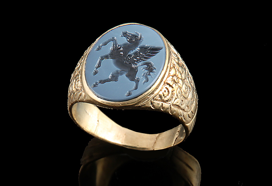 Silber vergoldet. Schiene mit feinem Reliefmuster. Lagenachat mit Darstellung eines Pegasus. D innen 22 mm. 10,8 g brutto.