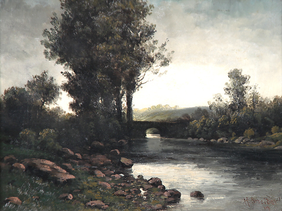 „Flusslandschaft mit steinerner Brücke“. Re. u. sign. H. Speidel, dat. (19)19. Öl/Lwd., 28 x 37 cm. R..