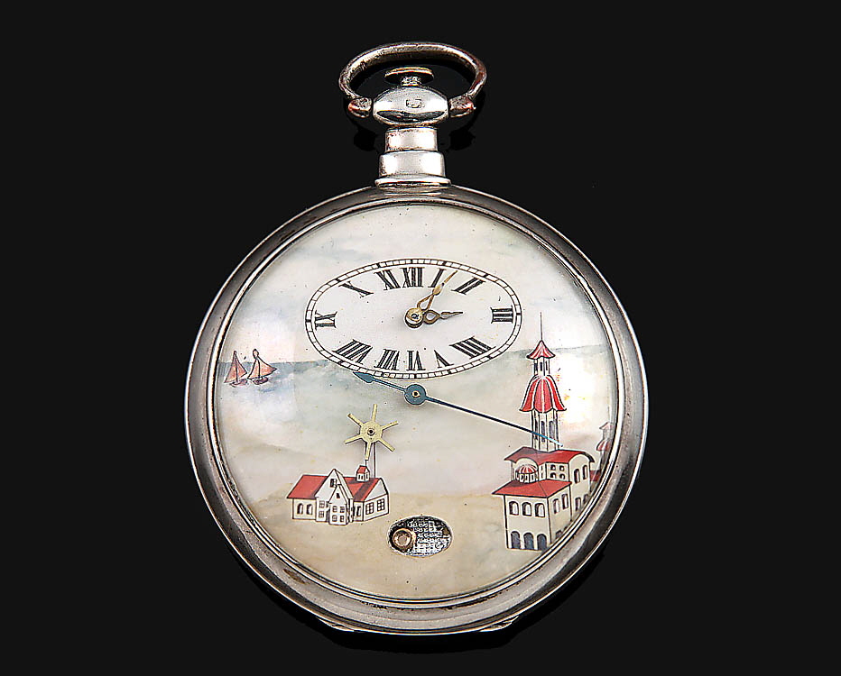 Ca. Ende 19. Jh.. Für den chinesischen Markt. Halbsavonette, Silbergehäuse. D 56 mm. Bemaltes Zifferblatt mit Häusern, Windmühle, Schiffen und Landschaft, bewegliches Windmühlenrad, oben im Oval röm. Ziffern, darunter Zentralsek., unten ovaler Ausschnitt mit Scheinpendel. Vergoldetes schweizer Uhrwerk mit feinen Reliefverzierungen. Gangbar. Schlüssel fehlt. Erneuerter Glasboden.