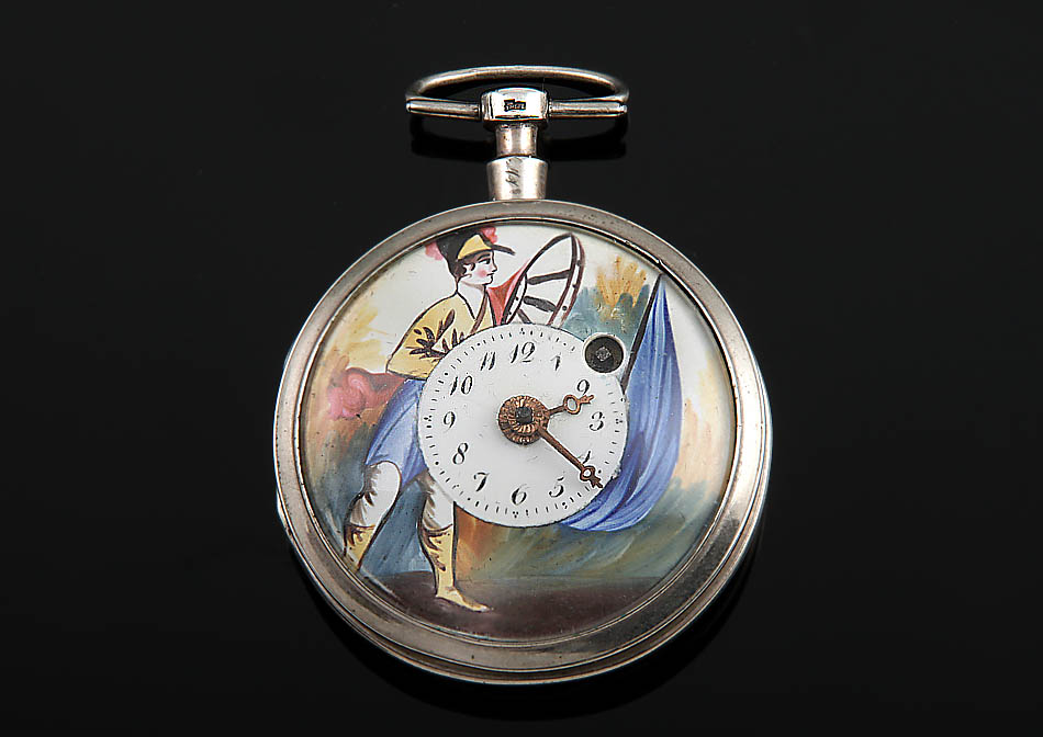 19. Jh.. Silbergehäuse. D 42 mm. Bunt bemaltes Emailzifferblatt, mittig runde Aussparung mit röm. Ziffern, vergoldete Zeiger. Vergoldetes Uhrwerk, gangbar, Schlüssel fehlt.