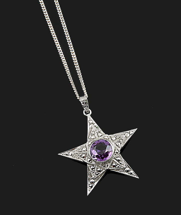 925er Silber. Anhänger mit synth. Amethyst und Markasiten. L ca. 4,3 cm. Schmale Gliederkette mit Ringösenschließe. Zus. 11,5 g brutto.