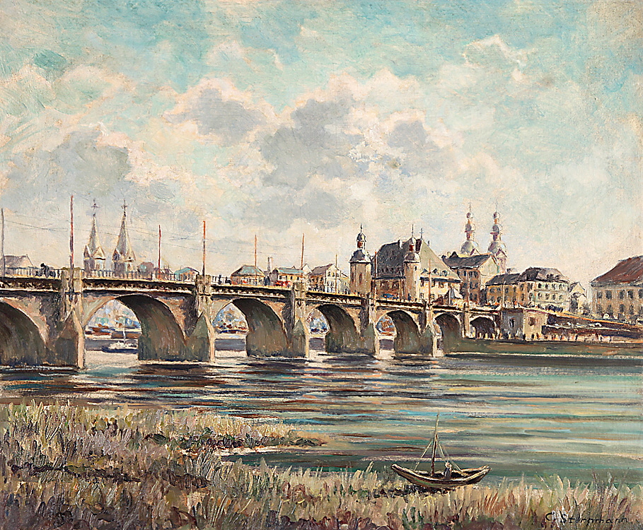 Deut. Landschafts- und Architekturmaler und Grafiker des 20. Jhs.. „Koblenz, Moselansicht mit Balduinbrücke“. Re. u. sign. C. Sternmann. Öl/Lwd., 50 x 61 cm. Auf Keilr..