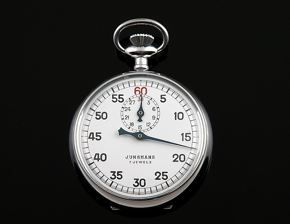 Junghans. Silberfarbenes Metallgehäuse. D 49 mm. Weißes Zifferblatt, schwarze und rote, arab. Ziffern, gebläute Zeiger. Werk mit 7 Steinen, Aufzug über Krone, gangbar. Nur mäßige Gebrauchsspuren.