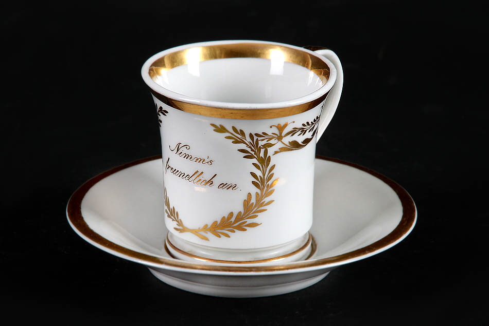 KPM Berlin, blaue Zeptermarke, ca. Ende 19. Jh.. Weiße, glänzende Glasur, Golddekor. Auf der Tasse Sinnspruch „Nimm’s freundlich an.“. H Tasse 7,3 cm, D Untertasse 13,7 cm.