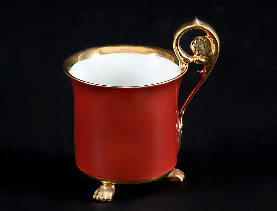 Fürstenberg, Manufakturstempel. Zylindrische Form mit ausschwingender Lippe, drei Tatzenfüßchen, geschwungener, oben eingerollter Henkel. Weiße und rotbraune Glasur, Golddekor. H 12 cm.