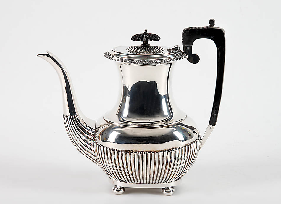 England, Sheffield. 925er Silber, Jahresbuchstabe ‚d‘ für 1896. Bauchiges Schultergefäß auf gedrückten Kugelfüßchen, konischer Hals oben ausschwingend mit Reliefrand, Scharnierdeckel mit Reliefmuster und Holzknauf, geschwungener Reliefausguss, kantiger, schwarz gebeizter Holzhenkel. H 23,7 cm. Mehrere kleine Dellen. 777g brutto.