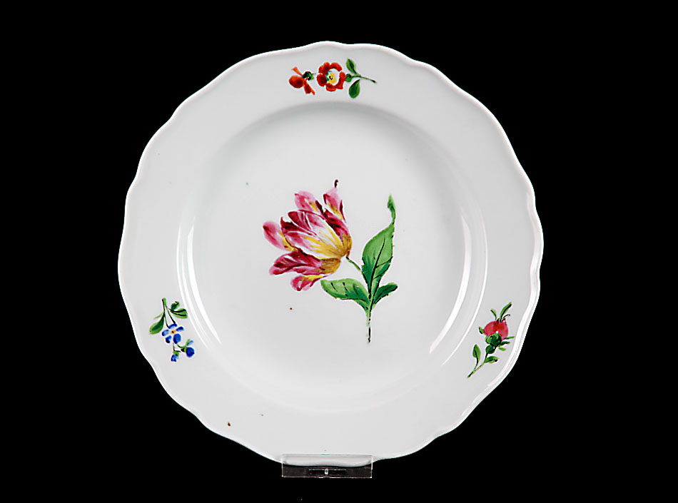Meissen, blaue Schwertermarke, vor 1924. Geschwungener Profilrand, buntes Blumenmuster. D 19,4 cm.