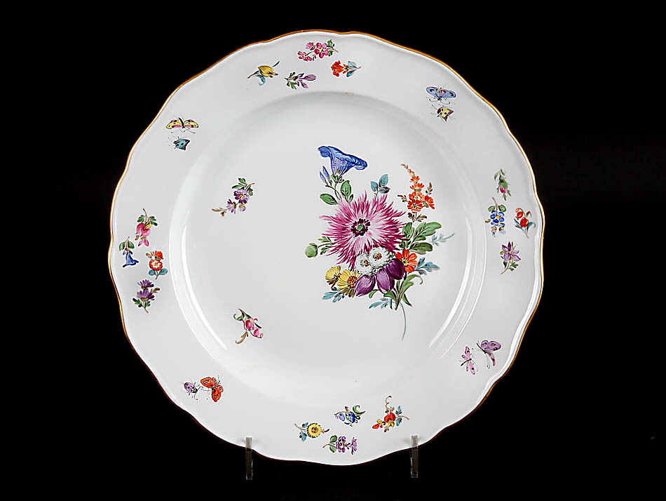 Meissen, blaue Schwertermarke mit Punkt, 1924-1934. Flache Form, geschwungener Goldrand, bunte Blumen- und Insektenbemalung. D 25,4 cm.